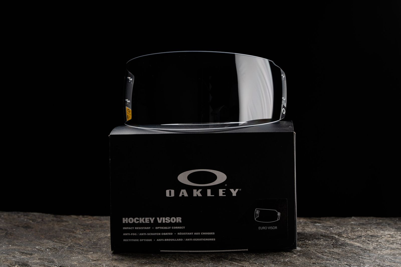 Oakleyn CE-Certifioitu jääkiekkokypärän visiiri. Kirkas Euro-Cut -malli.Varustettu naarmuuntumisen- sekä huurtumisenesto-ominaisuuksilla.